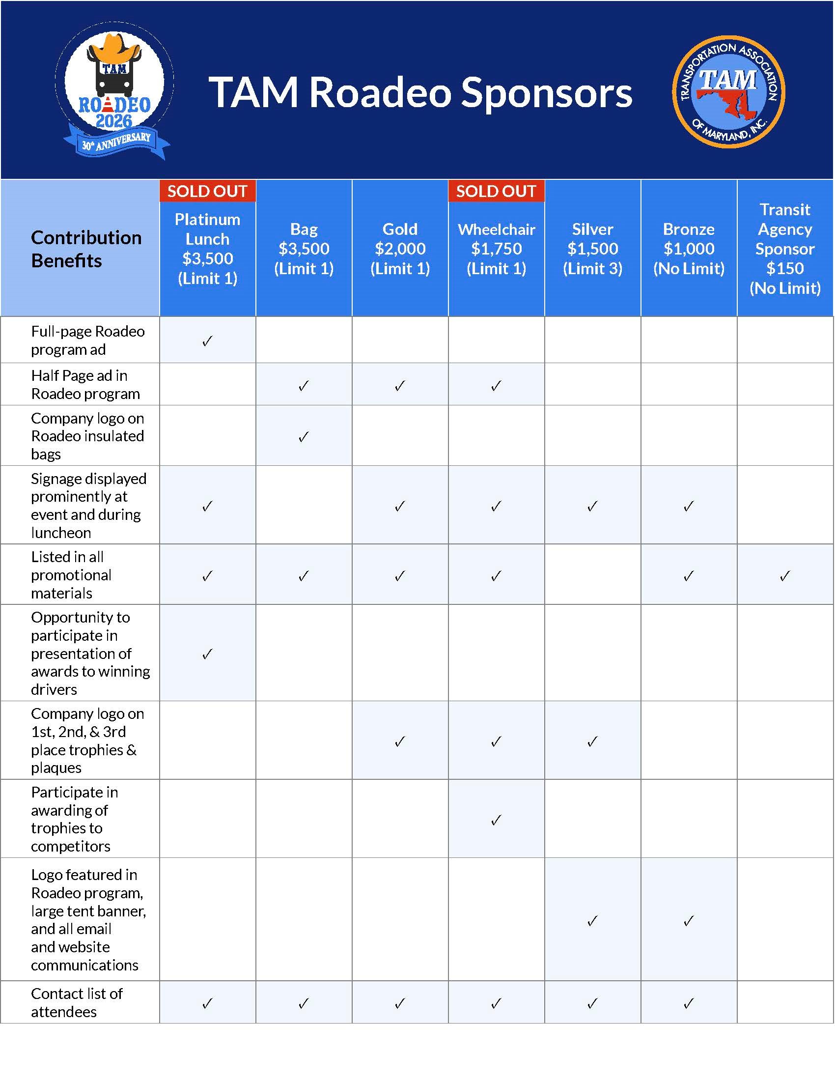 Driver Qualifications: Only drivers meeting the following criteria are eligible to compete in the Roadeo A. Is employed as a driver engaged in Demand-Response or Fixed-Route service. B. Has not had a chargeable (avoidable) accident since March 2025. C. Has not had a suspension from duties or any disciplinary action since March 2025. D. Has no points or pending violations. E. Has supervisors’ approval. Sponsors The support of our sponsors makes the Roadeo possible every year! The Roadeo attracts over 100 attendees each year from across Maryland. All sponsors will be recognized throughout the event. See below for sponsorship opportunities - you can reserve your sponsorship at www.taminc.org/roadeo2026