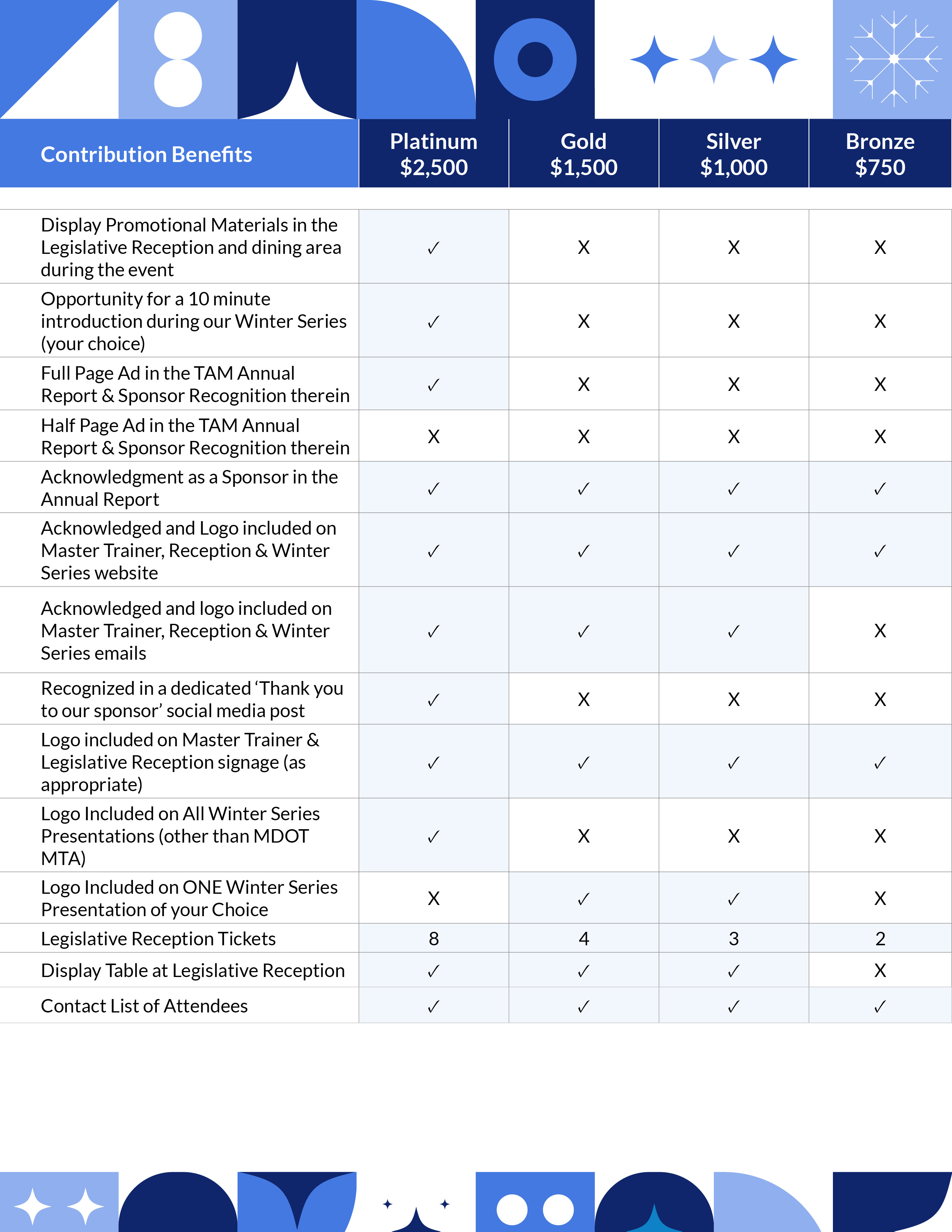 Why invest in a TAM Winter Sponsorship? TAM needs assistance from the transit community to help us keep putting on events like our Legislative Reception, our Winter Series, our Master Trainer event, publishing our annual report, and hosting other training events in the first quarter of 2026. Becoming a winter sponsor offers your organization an effective way to connect with your target audience: transit leaders and over 120 transit providers and associated members; increase awareness of your work and your services; and build your brand within the transit community. TAM events are the best way to introduce yourselves and your products to the larger Maryland community transit industry! Gain exposure of your product through advertisements, reach new audiences, and help support major TAM events through your contributions. You can sign up to become a contributor here. Sponsor Levels Winter Sponsorship comes with sponsorship of not one but three major TAM events, as well as recognition in our forthcoming Annual Report. As the only transit events in Maryland of their kind, contributing to the sponsorship of the 2026 Legislative Reception and Transit Showcase, our Winter Series, and our Master Trainer Workshop is a unique opportunity to help you to reach your target audience and build your brand. Find a sponsorship level that best suits your business.